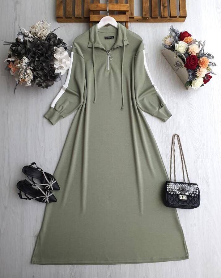 LUN KOLU ŞERİTLİ YARIM FERMUARLI BAĞCIKLI RAHAT KALIP ELBİSE B8-4-2414-07-YEŞİL