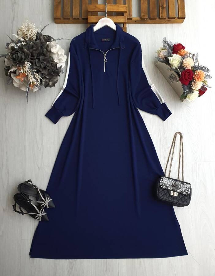 LUN KOLU ŞERİTLİ YARIM FERMUARLI BAĞCIKLI RAHAT KALIP ELBİSE B8-4-2414-12-LACİVERT