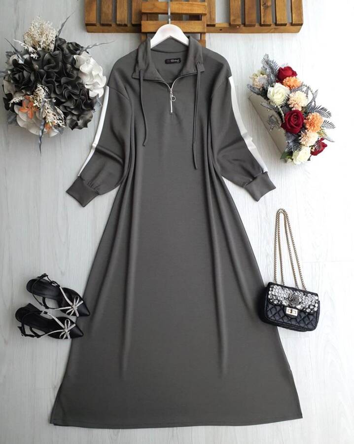 LUN KOLU ŞERİTLİ YARIM FERMUARLI BAĞCIKLI RAHAT KALIP ELBİSE B8-4-2414-58-FÜME