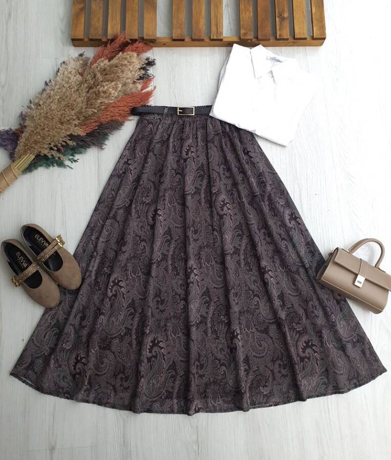 LUNELA ETNİK DESEN DERİ KEMERLİ BELİ LASTİKLİ ASTARLI ŞİFON ETEK B9-3-6103-37-KAHVE