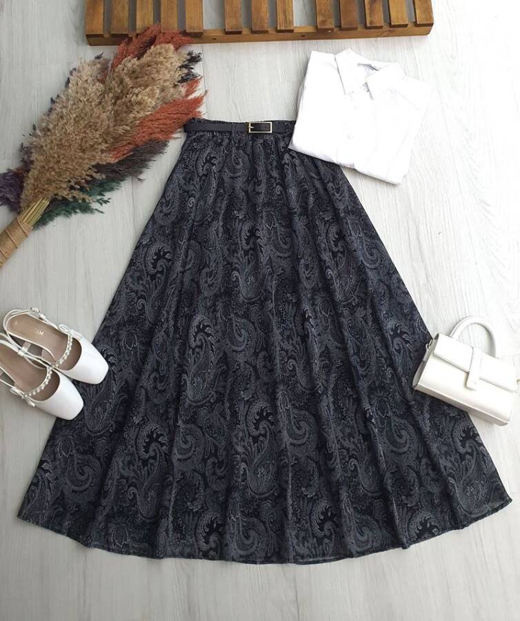LUNELA ETNİK DESEN DERİ KEMERLİ BELİ LASTİKLİ ASTARLI ŞİFON ETEK B9-3-6103-58-FÜME