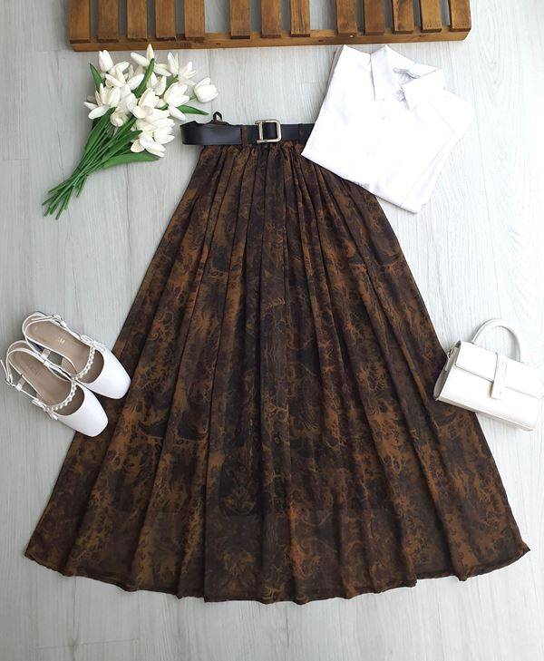 MALEL DUMAN DESENLİ DERİ KEMERLİ BELİ LASTİKLİ ASTARLI ŞİFON ETEK A7-5-6115-19-HARDAL