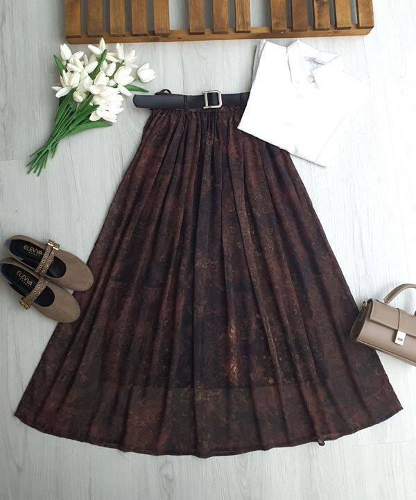 MALEL DUMAN DESENLİ DERİ KEMERLİ BELİ LASTİKLİ ASTARLI ŞİFON ETEK A7-5-6115-37-KAHVE