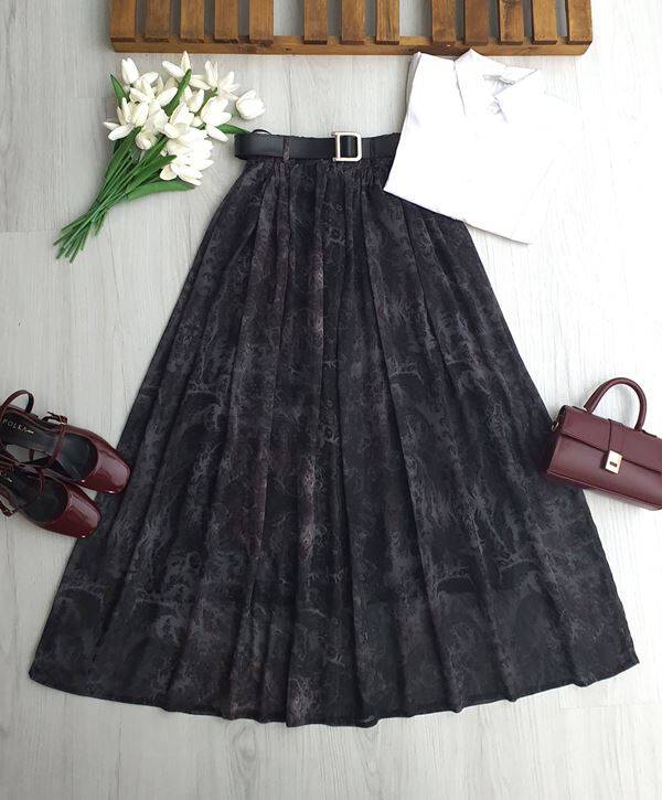 MALEL DUMAN DESENLİ DERİ KEMERLİ BELİ LASTİKLİ ASTARLI ŞİFON ETEK A7-5-6115-58-FÜME