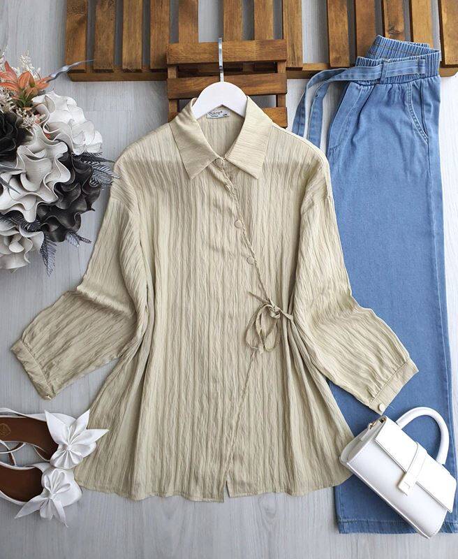 MEDSA ÇAPRAZ DÜĞMELİ YAN BAĞLAMALI GÖMLEK TUNİK C6-5536-34-BEJ