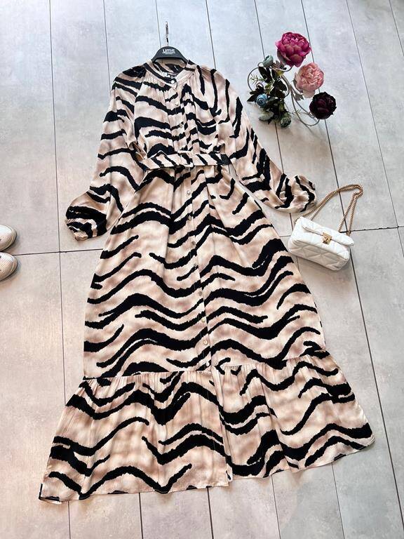 MEYLA KEMERLİ DESENLİ ÖNÜ DÜĞMELİ ELBİSE D2-2304-34-BEJ