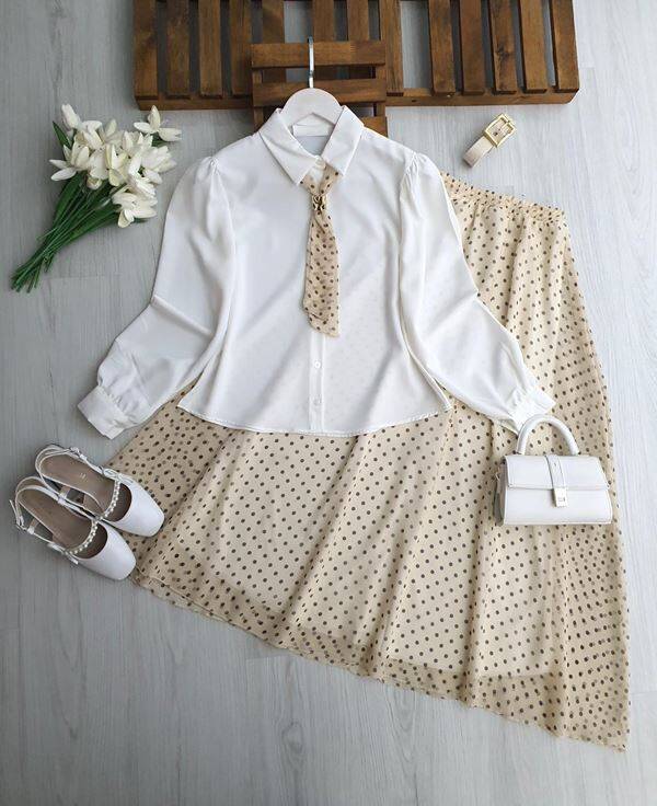 MUGDE FULARLI GÖMLEK DERİ KEMERLİ ASTARLI ŞİFON ETEK TAKIM 1750-34-BEJ