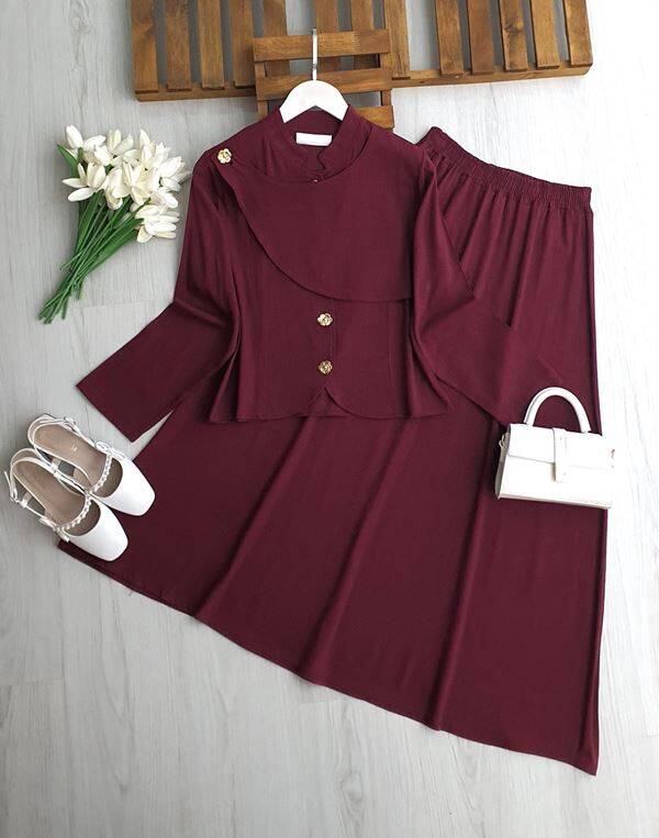 NAKSE ASİMETRİK PARÇALI GOLD DÜĞMELİ KETEN TAKIM 5712-04-BORDO