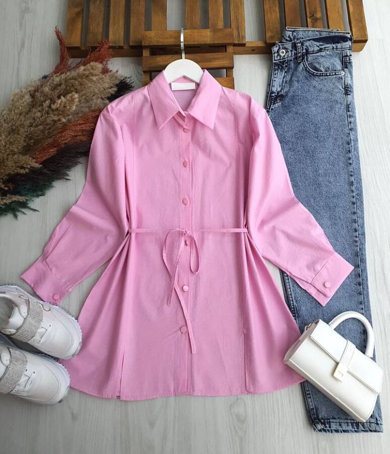 NALKDA ÖNÜ YIRTMAÇLI BELİ İPLİ GÖMLEK TUNİK B2-6-5657-05-PUDRA