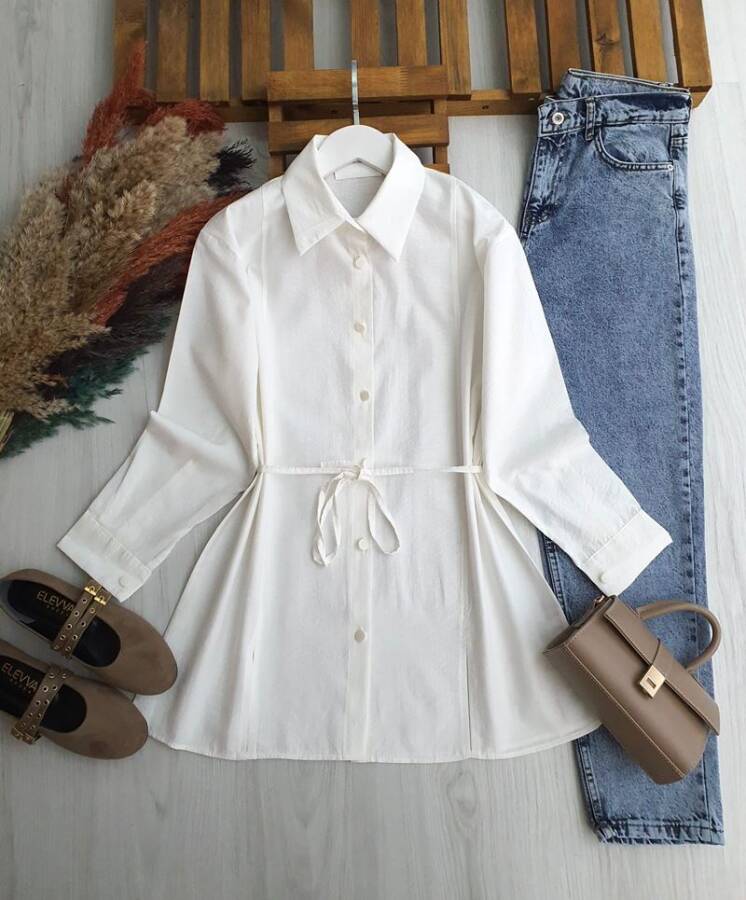 NALKDA ÖNÜ YIRTMAÇLI BELİ İPLİ GÖMLEK TUNİK B2-6-5657-20-BEYAZ
