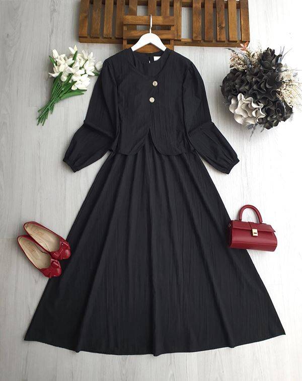 NENGA İKİ DÜĞMELİ CEKET BELİ LASTİKLİ ELBİSE TAKIM A6-4-2418-01-SİYAH