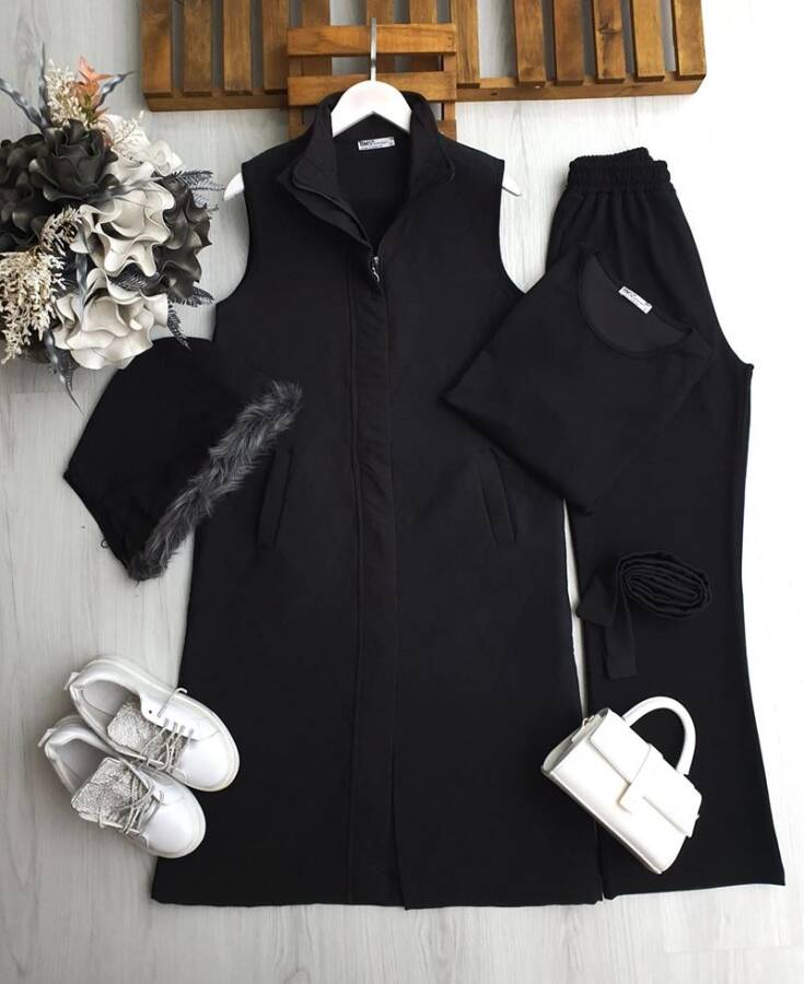 NİLS FERMUARLI KEMERLİ ÇIKARILABİLİR KAPŞONLU YELEK TUNİK PANTOLON ÜÇLÜ TAKIM 1677-01-SİYAH