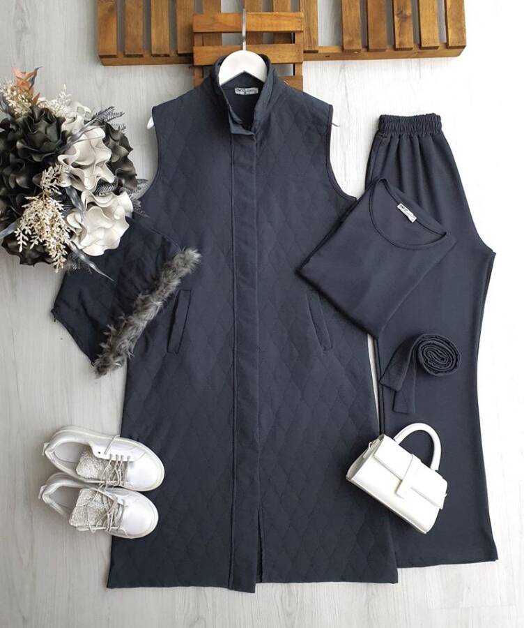 NİLS FERMUARLI KEMERLİ ÇIKARILABİLİR KAPŞONLU YELEK TUNİK PANTOLON ÜÇLÜ TAKIM 1677-58-FÜME