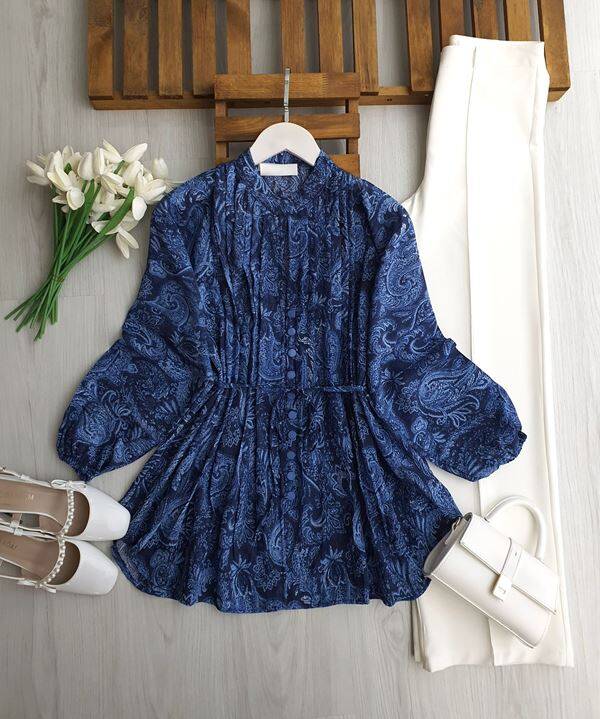NODK HAKİM YAKA BRİT DÜĞMELİ BASKILI SALAŞ GÖMLEK TUNİK B4-2-5731-11-İNDİGO