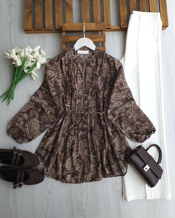 NODK HAKİM YAKA BRİT DÜĞMELİ BASKILI SALAŞ GÖMLEK TUNİK B4-2-5731-37-KAHVE