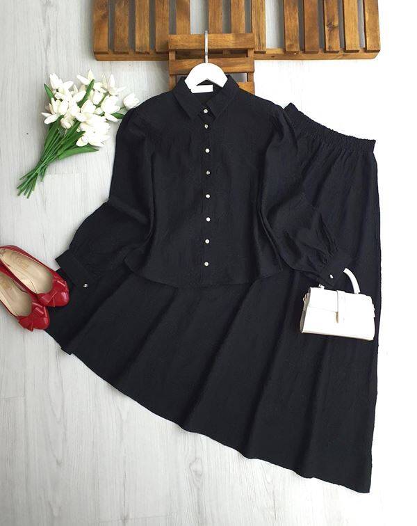 NUZGİ KENDİNDEN DESENLİ JAKARLI ETEKLİ TAKIM 1735-01-SİYAH