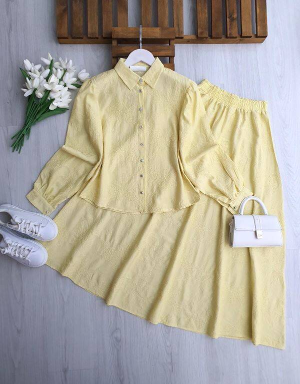 NUZGİ KENDİNDEN DESENLİ JAKARLI ETEKLİ TAKIM 1735-23-SARI