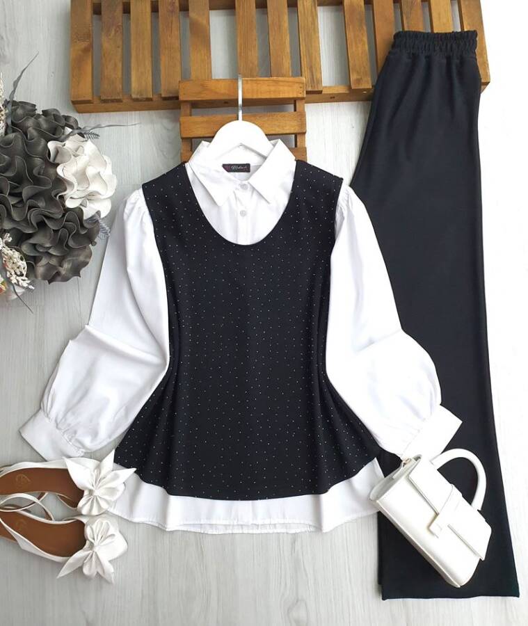 ODGO TAŞLI SÜVETER İÇİ GÖMLEKLİ ÜÇLÜ TAKIM B4-2-1654-01-SİYAH