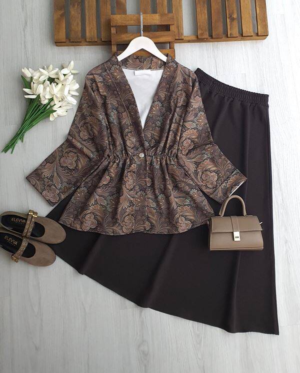 ODNUL TEK DÜĞME SULU DESEN CEKET ETEKLİ TAKIM B5-5-1751-37-KAHVE
