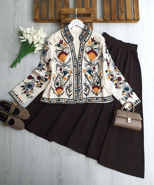 OGDEZ ÇİÇEK NAKIŞLI ASTARLI CEKET 3229-50-KEMİK