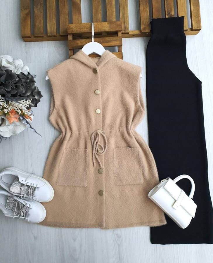 OGSAY BELİ İPLİ DÜĞMELİ KAPÜŞONLU SAKAL İPLİK YELEK 3223-48-BİSKÜVİ