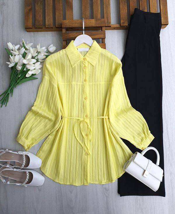 OLBEY ÜST DİKİŞLİ BELİ İPLİ SALAŞ GÖMLEK TUNİK 5690-23-SARI