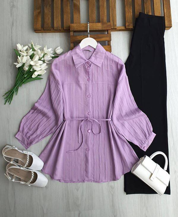OLBEY ÜST DİKİŞLİ BELİ İPLİ SALAŞ GÖMLEK TUNİK 5690-32-LİLA