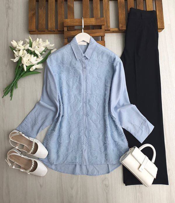 OLKE TÜL İŞLEMELİ GÖMLEK TUNİK B1-3-5675-10-MAVİ