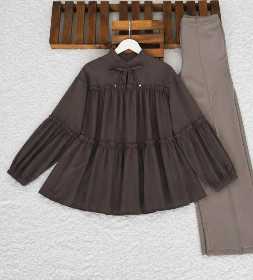 ONGE YAKA BAĞCIKLI KAT KAT SALAŞ TUNİK 5713-37-KAHVE