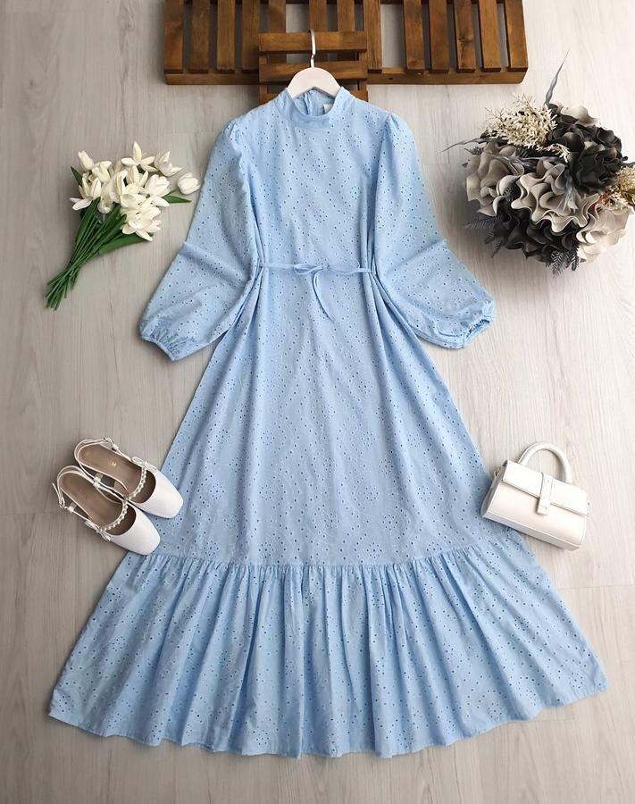ONLS HAKİM YAKA ALTI FIRFIRLI ASTARLI BRODE ELBİSE B6-3-2420-10-MAVİ