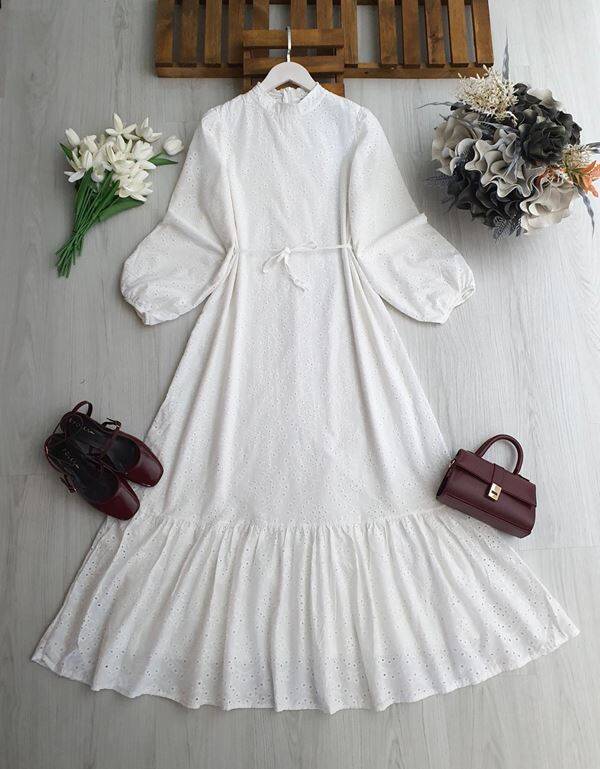 ONLS HAKİM YAKA ALTI FIRFIRLI ASTARLI BRODE ELBİSE B6-3-2420-20-BEYAZ