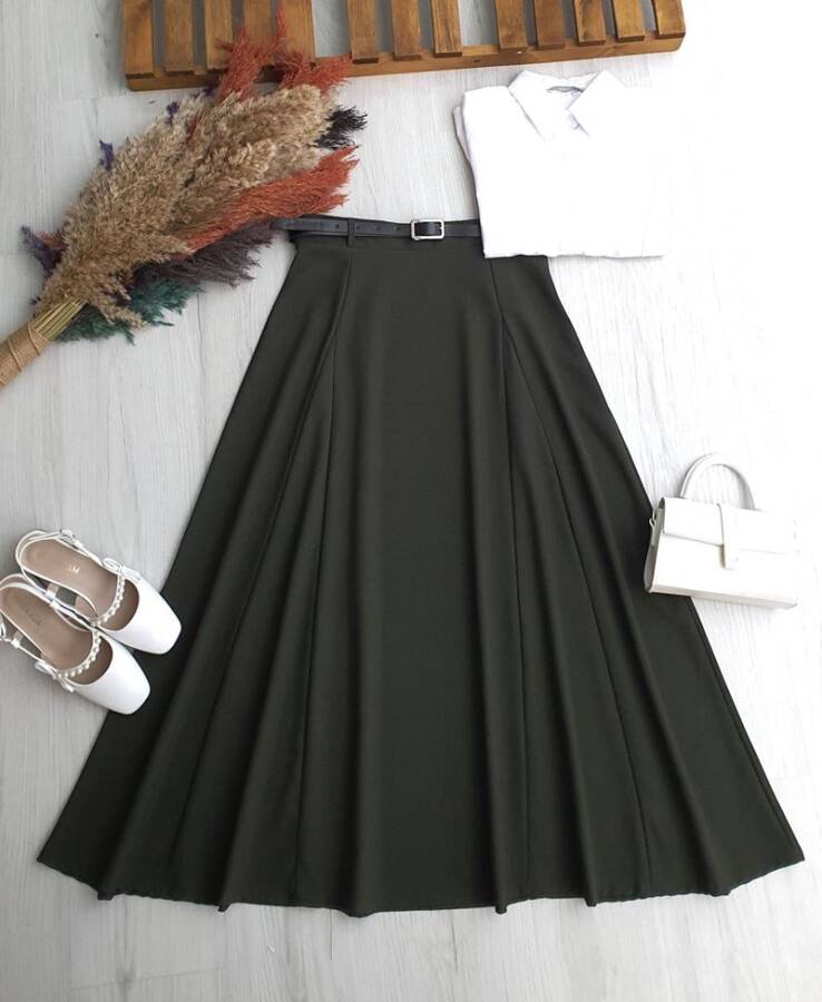 OPAYA KUP DİKİŞLİ DERİ KEMERLİ BEL YANDAN FERMUARLI POLİVİSKON ETEK B6-2-6099-09-HAKİ
