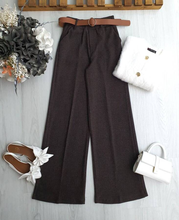 OSTE DERİ KEMERLİ BELİ LASTİKLİ BALIKSIRTI PANTOLON 6084-37-KAHVE