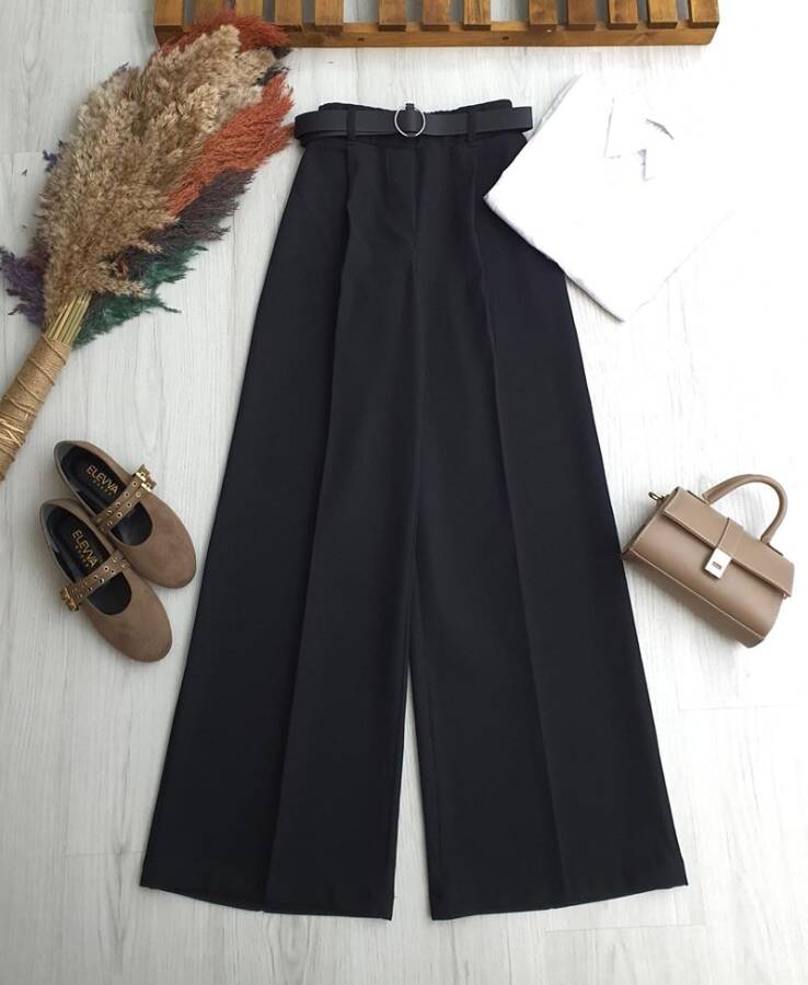 OWAV DERİ KEMERLİ BELİ ARKADAN LASTİKLİ BOL PANTOLON 6102-01-SİYAH