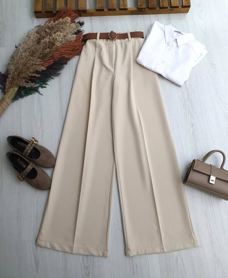OWAV DERİ KEMERLİ BELİ ARKADAN LASTİKLİ BOL PANTOLON 6102-34-BEJ