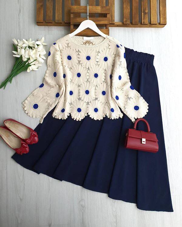 OYDES PAPATYA İŞLEMELİ DANTEL ÖRGÜ BLUZ 8202-10-MAVİ