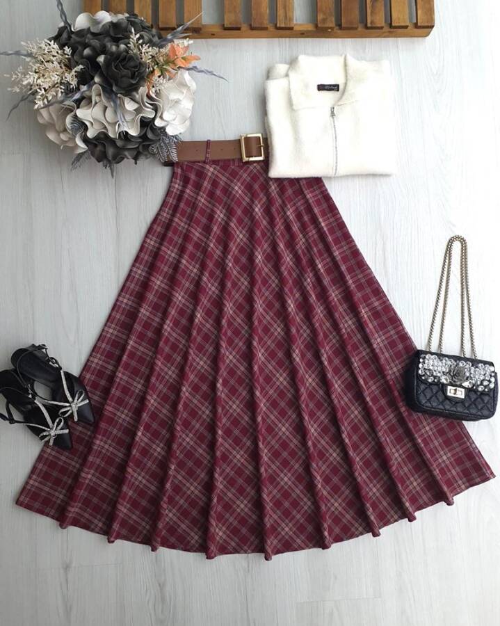 OYFE DERİ KEMERLİ BEL YANDAN FERMUARLI EKOSE KİLOŞ ETEK B7-3-6086-04-BORDO