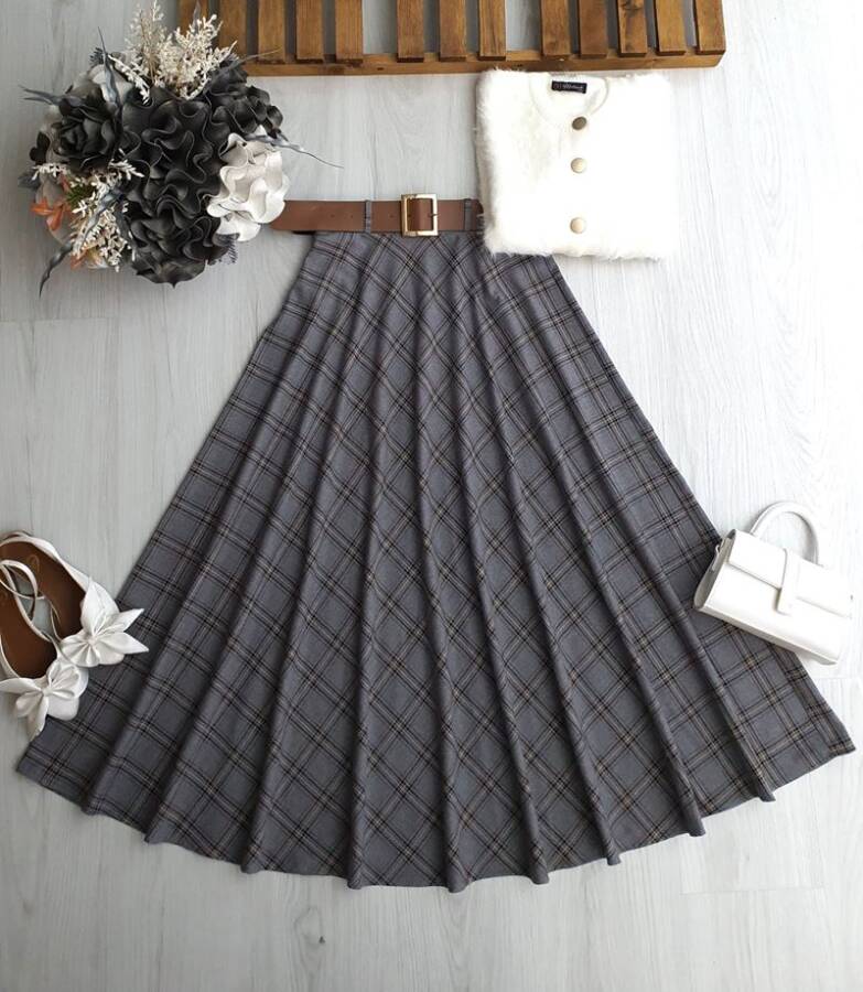 OYFE DERİ KEMERLİ BEL YANDAN FERMUARLI EKOSE KİLOŞ ETEK B7-3-6086-26-GRİ