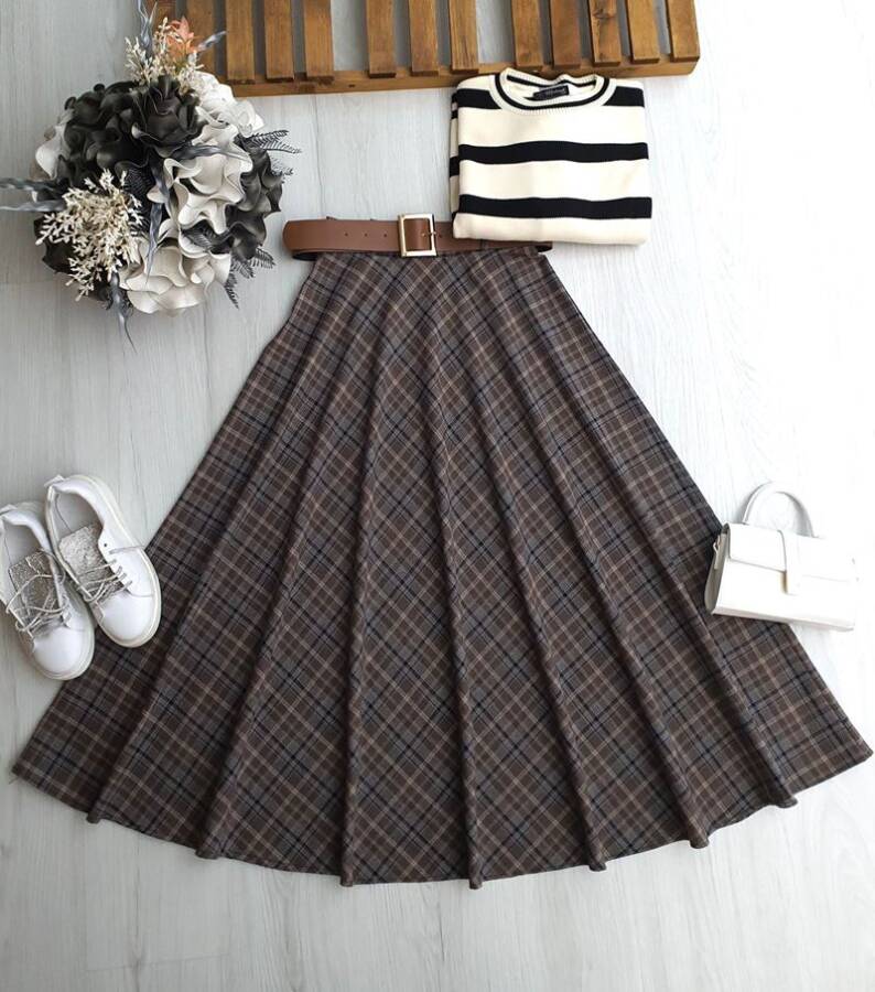 OYFE DERİ KEMERLİ BEL YANDAN FERMUARLI EKOSE KİLOŞ ETEK B7-3-6086-37-KAHVE