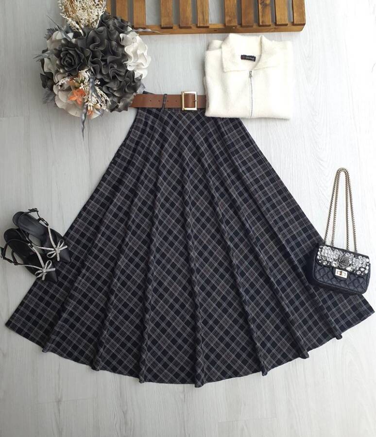 OYFE DERİ KEMERLİ BEL YANDAN FERMUARLI EKOSE KİLOŞ ETEK B7-1-6086-97-KOYU FÜME