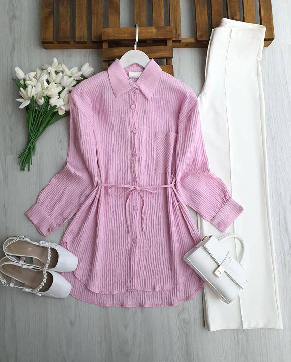 PEBFA TEK CEPLİ BELİ İPLİ GÖMLEK TUNİK 5706-05-PUDRA