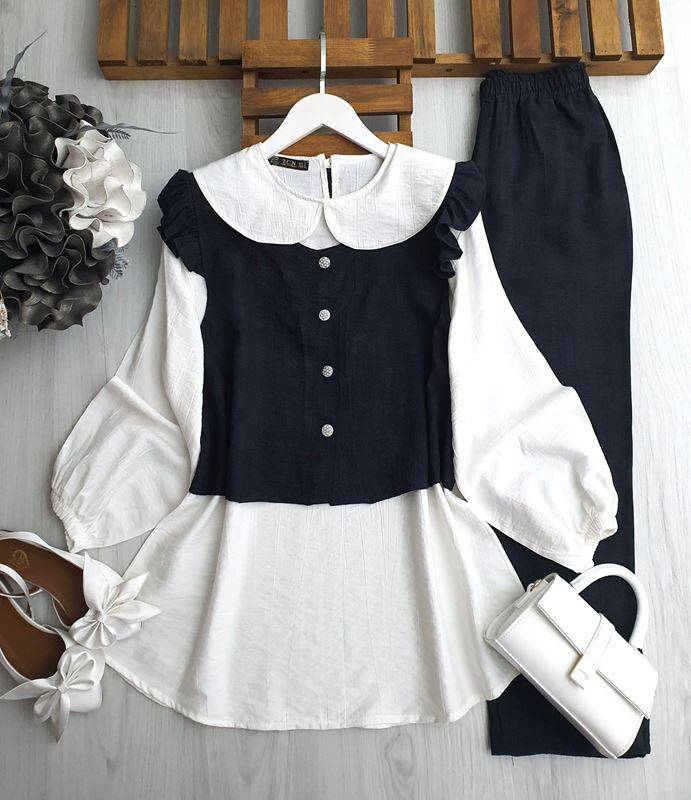 PECA BEBE YAKA İÇ TUNİK OMUZ FIRFIRLI YELEKLİ ÜÇLÜ TAKIM A10-1-1645-01-SİYAH