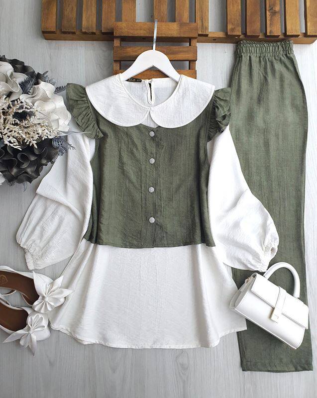 PECA BEBE YAKA İÇ TUNİK OMUZ FIRFIRLI YELEKLİ ÜÇLÜ TAKIM A10-1-1645-09-HAKİ