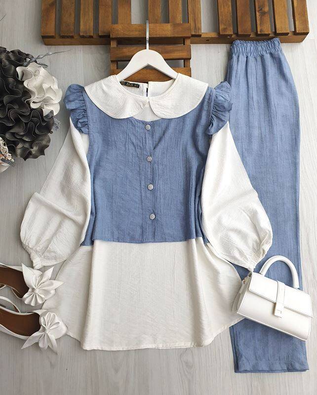 PECA BEBE YAKA İÇ TUNİK OMUZ FIRFIRLI YELEKLİ ÜÇLÜ TAKIM A10-1-1645-13-BEBE MAVİSİ