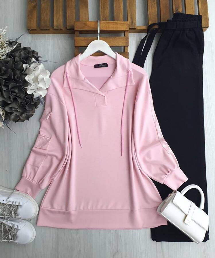 PELİM KOL PUL PAYET CEP VE ŞERİTLİ TUNİK 5629-05-PUDRA