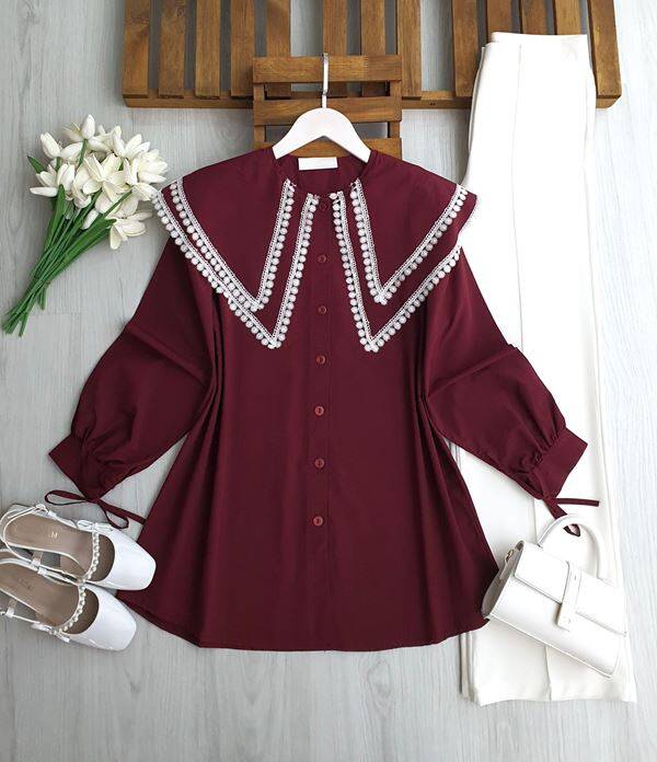 PESEH DANTELLİ ÇİFT PELERİN YAKA SALAŞ GÖMLEK TUNİK 5730-04-BORDO