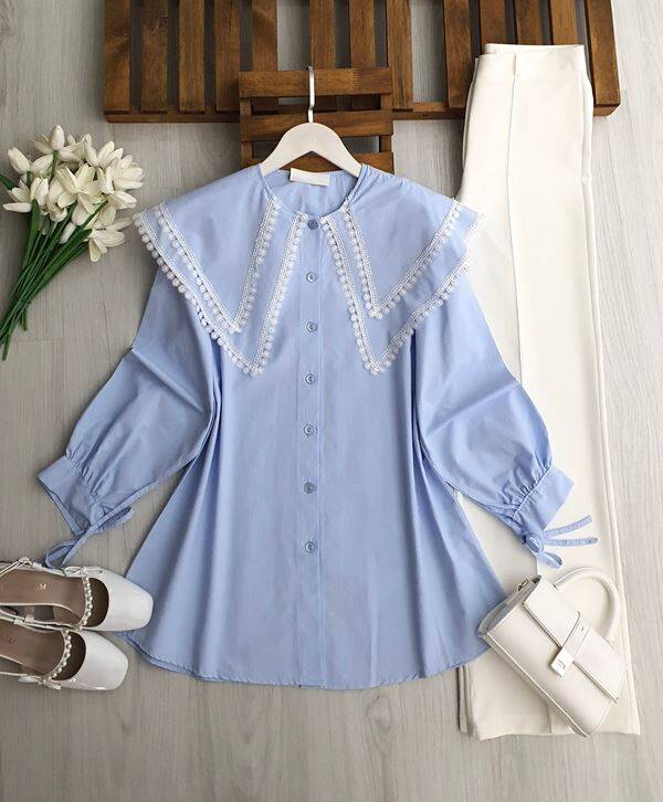 PESEH DANTELLİ ÇİFT PELERİN YAKA SALAŞ GÖMLEK TUNİK 5730-10-MAVİ