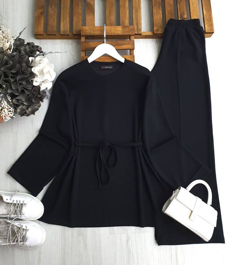 PİLGE KIVRIK KOL BELİ İPLİ SALAŞ TUNİK ÇİMALI BOL PANTOLON MUADİL TAKIM A6-5-1674-01-SİYAH