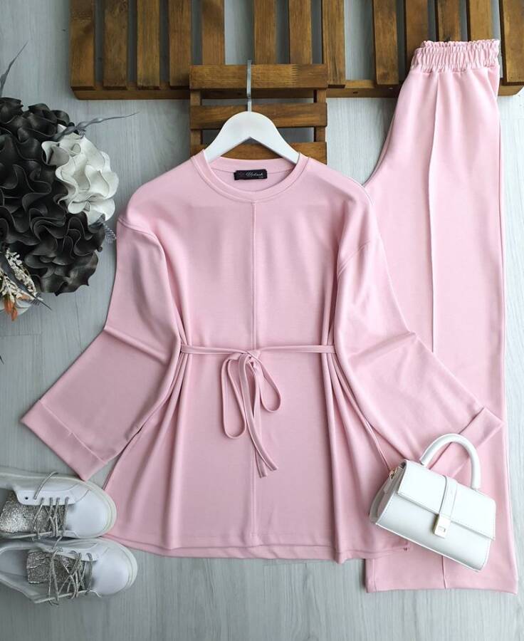 PİLGE KIVRIK KOL BELİ İPLİ SALAŞ TUNİK ÇİMALI BOL PANTOLON MUADİL TAKIM A6-5-1674-05-PUDRA
