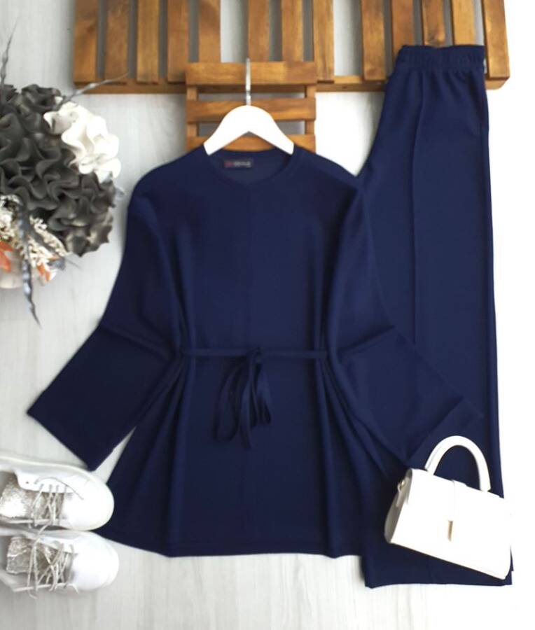 PİLGE KIVRIK KOL BELİ İPLİ SALAŞ TUNİK ÇİMALI BOL PANTOLON MUADİL TAKIM A6-5-1674-12-LACİVERT